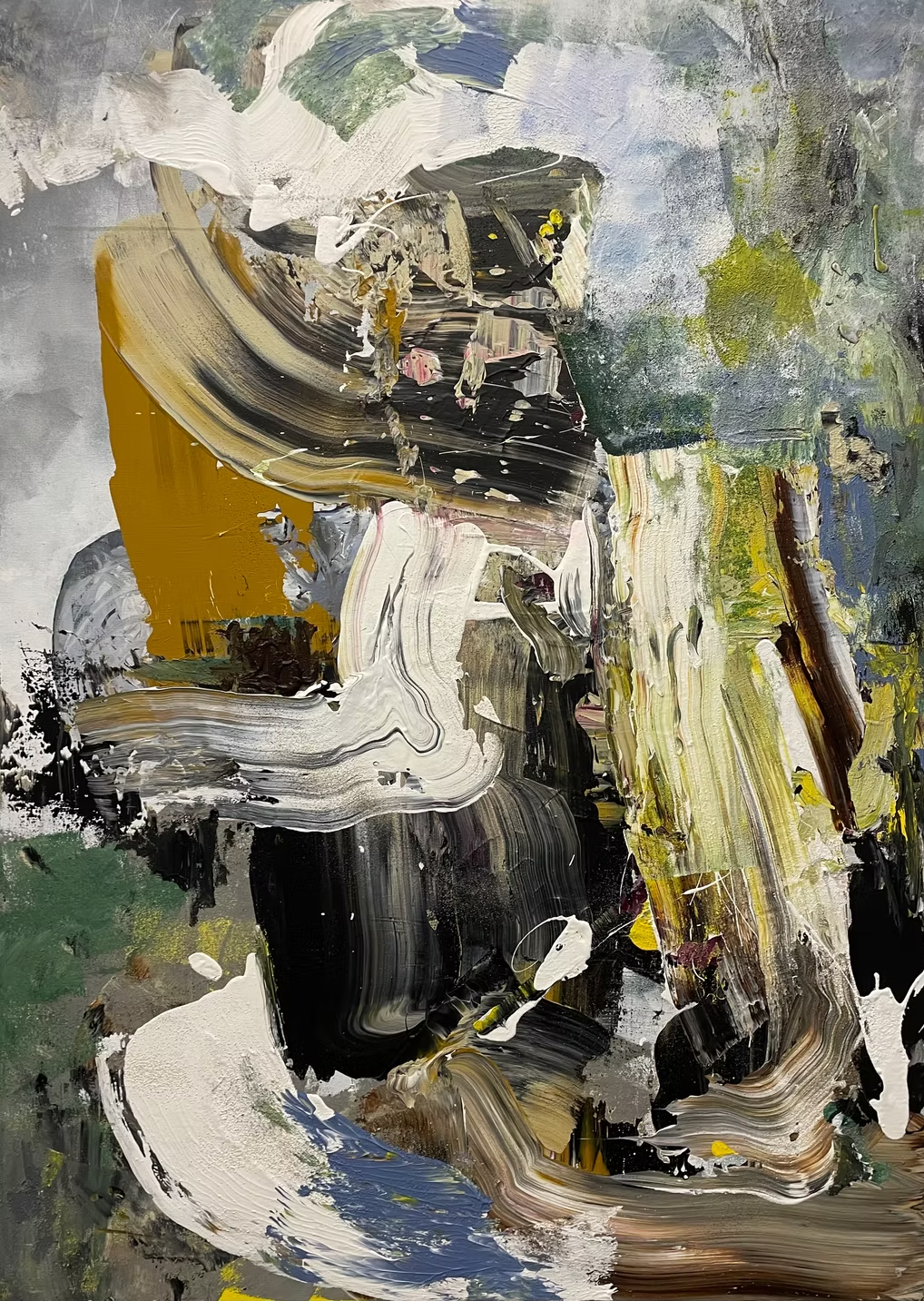 Jeg fylder det hvide lærred langsomt ud. Forsøger forskellige kompositioner. Igen og igen. Jeg ved, momentet kommer, hvor jeg slipper det hele. Giver mig hen. Det er den tilstand, jeg søger. Intuitionen tager over.