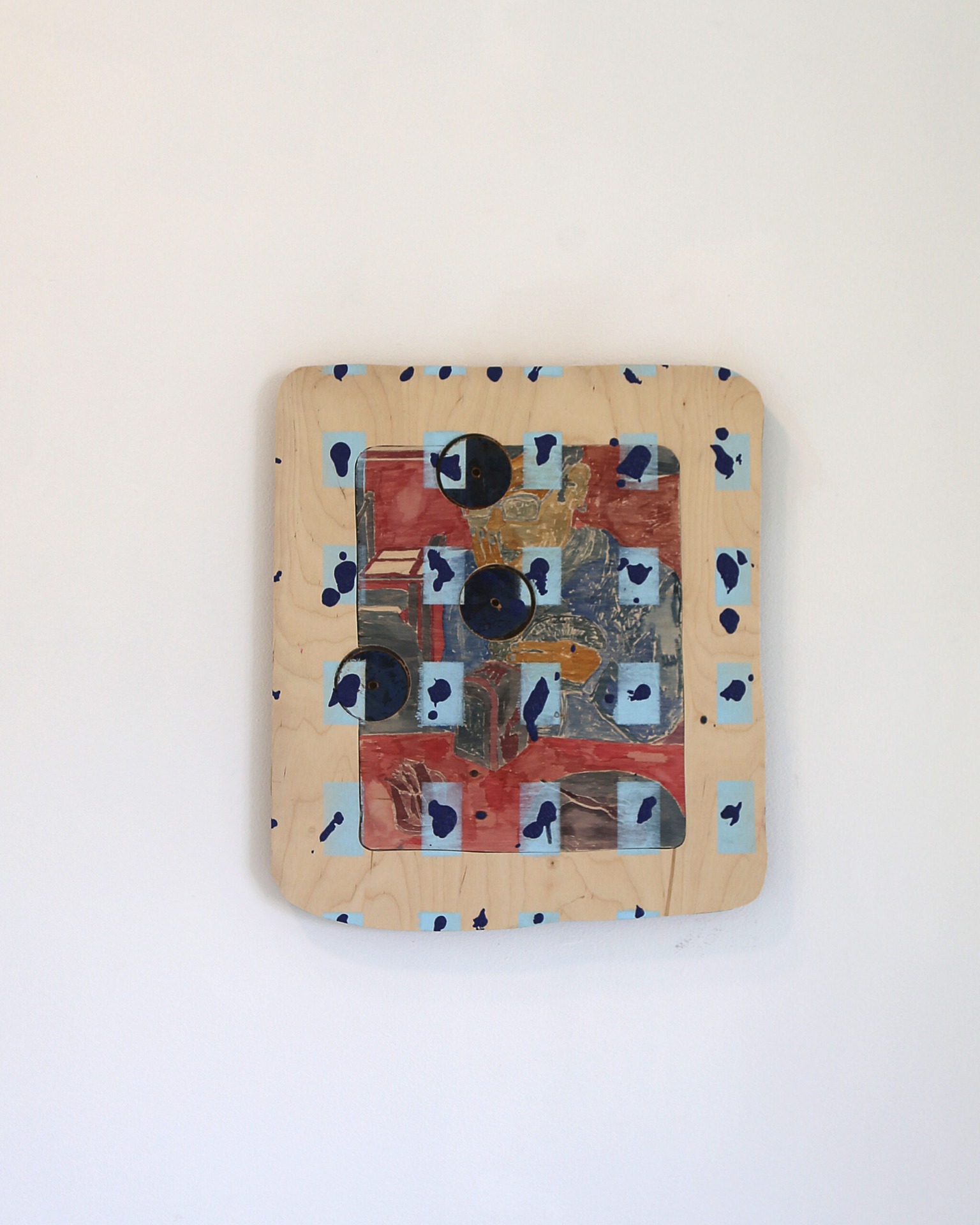 Gentagelsen. Motiver fra det nære landskab. I begyndelsen af processen er billederne næsten altid noget hjemligt, genkendeligt. Som senere sløres. Forskydes. Mine værker bliver lavet af fundne ting. Finer/træ.